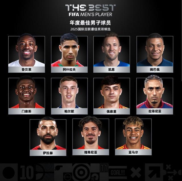 11月7日,FIFA国际足联公布了2025年年度最佳男子球员的11人候选名单。登贝莱、姆巴佩、亚马尔、凯恩等人在列,曼城哈兰德则无缘入选。