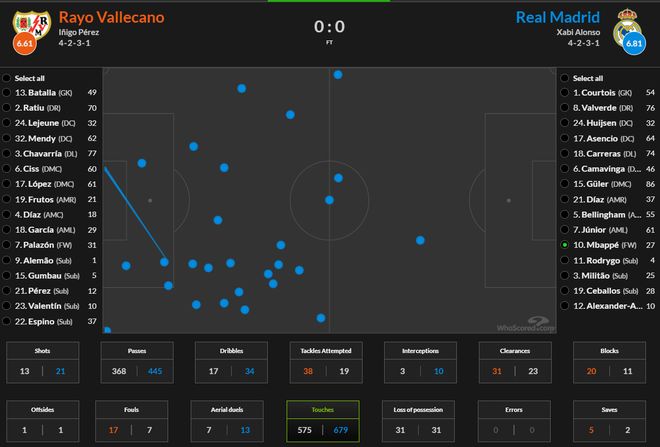 应该说两支球队在场面上是势均力敌的,皇马没有展现出任何的优势。这也跟姆巴佩的接球习惯有关系。他在本场比赛中,一共才在巴列卡诺禁区内触球3次,跟上一场与利物浦比赛时是一样的。