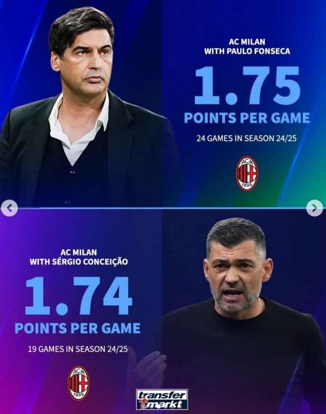 隔壁AC米兰的戏码比这更精彩,而且一个赛季还上演了两回!首先是去年夏窗签下的新帅丰塞卡,但他执教不到半年就下课,一方面是他执教战绩不佳,任上胜率只有50%,当然最主要的还是失去了对更衣室的控制,他采取了胡萝卜+大棒的管理策略,而不是像皮奥利一样哄着球员,这导致他与队内莱奥、特奥等多名核心球员发生矛盾,两人甚至在比赛中上演过“场边喝水门”事件,这相当于将更衣室矛盾公之于众,这加速了丰塞卡的下课。