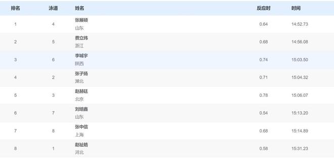 此前的预赛张展硕就有着非常出色的表现,他以15分15秒08的成绩排名预赛第1位。费立纬以0.35秒之差排在张展硕之后,北京队的赵赫廷是另一位在预赛游进15分16秒之内的选手。