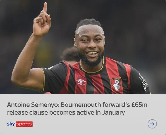 天空体育消息,塞梅约和伯恩茅斯的合同中有价值6500万英镑的违约金条款,且明年一月份就会生效。