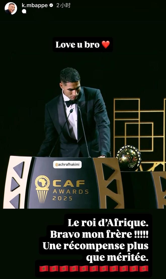在非洲足联年度颁奖典礼上,阿什拉夫荣获2025年度非洲足球先生称号,他在评选中击败了萨拉赫和奥斯梅恩。姆巴佩在社媒第一时间为好兄弟送上祝福。