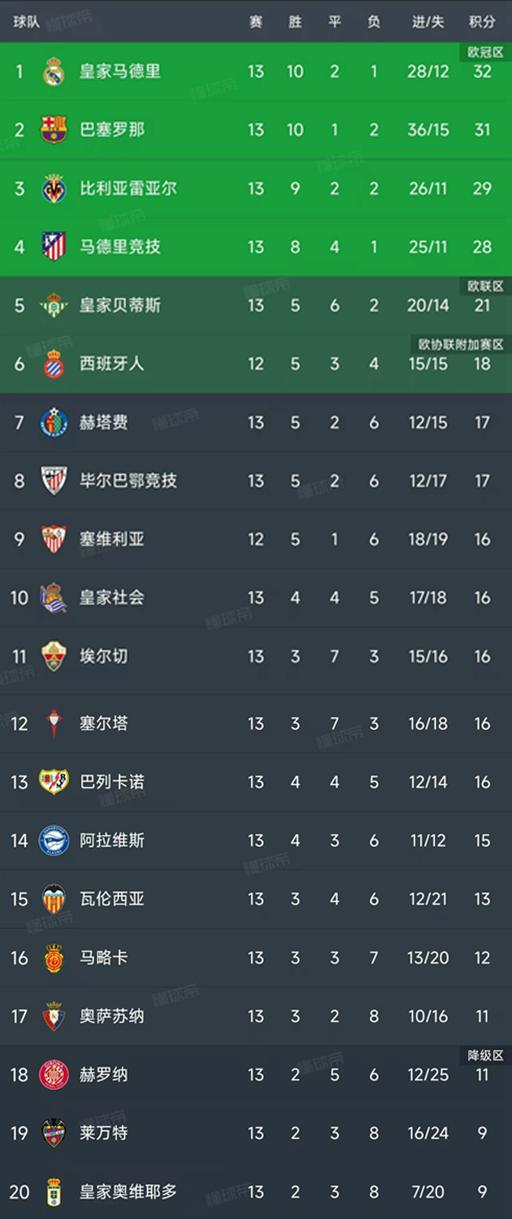 随着皇马2-2埃尔切,西甲第13轮最新积分榜如下,巴萨落后皇马1分
