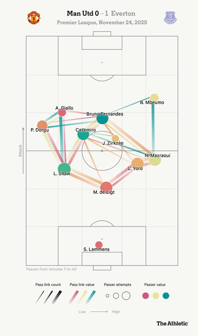 但是,当埃弗顿无缝应对了人数劣势,彼此理解各自角色时,曼联却看起来像是从未一起踢过球。进攻支离破碎,传球频频失误,最尴尬的一幕是卡塞米罗将球踢到了布鲁诺-费尔南德斯身后五码处直接出了边线。