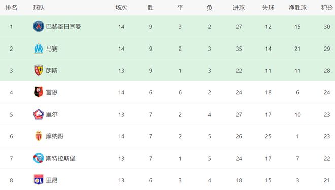 在积分榜上,巴黎圣日耳曼依然占据榜首位置,总积分是30分。马赛没能利用巴黎圣日耳曼掉链子的机会登顶,有些可惜。马赛总积分29分,以1分之差排名第2。第3的是朗斯,拿到28分。没想到法甲的冠军争夺也变得如此激烈。巴黎圣日耳曼的卫冕难度看起来不小。雷恩以24分排第4。第5的是里尔,拿到23分。摩纳哥也是23分,排名第6。