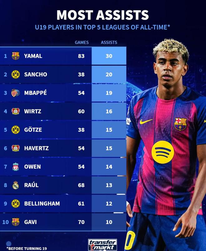 五大联赛历史U19助攻榜:亚马尔、桑乔、姆巴佩前三