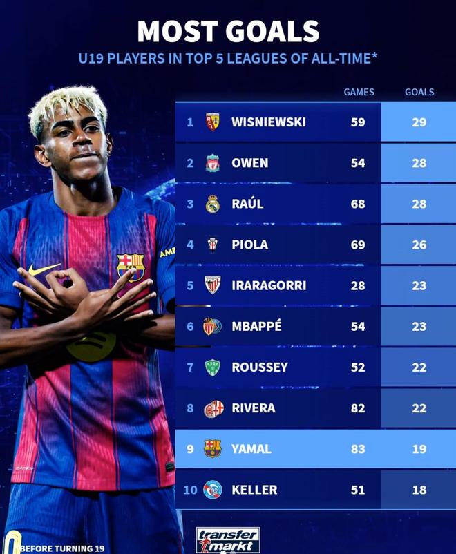 五大联赛历史U19进球榜:欧文、劳尔、姆巴佩、亚马尔上榜