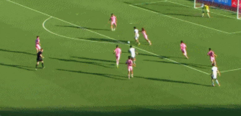 第8分钟,梅西1v3摆脱分球策动反击,阿连德高速杀入禁区之后传中,造成对方球员奥坎波自摆乌龙,迈阿密国际1-0领先。