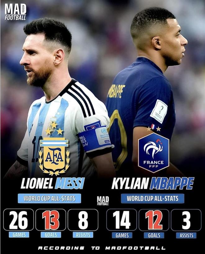从现在这组数据来看,姆巴佩在世界杯上后来居上的机会非常大。梅西是26场13球8助攻,一共21次直接参与进球;姆巴佩只踢了14场就已经12球3助攻,15次参与进球,场均进球和场均参与进球都明显更高。简单说,同样是在世界杯这个舞台,姆巴佩单位时间把数据堆得更快。