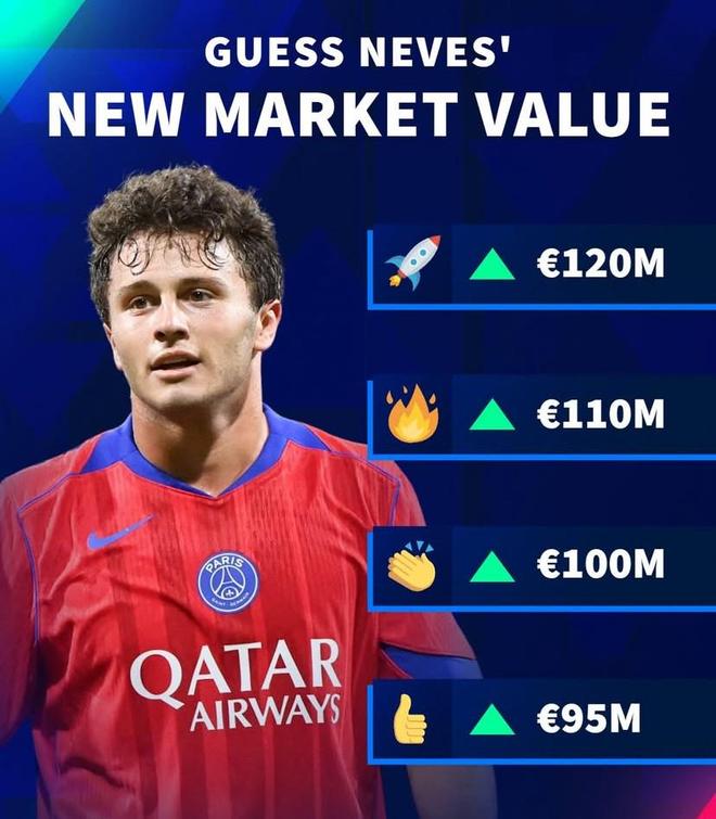 德转将在12月15日更新法甲球员的身价,此次他们给出的若昂-内维斯三个身价更新的选项分别为上涨至1.2亿欧元、上涨至1.1亿欧元、上涨至1亿欧元以及上涨至9500万欧元。