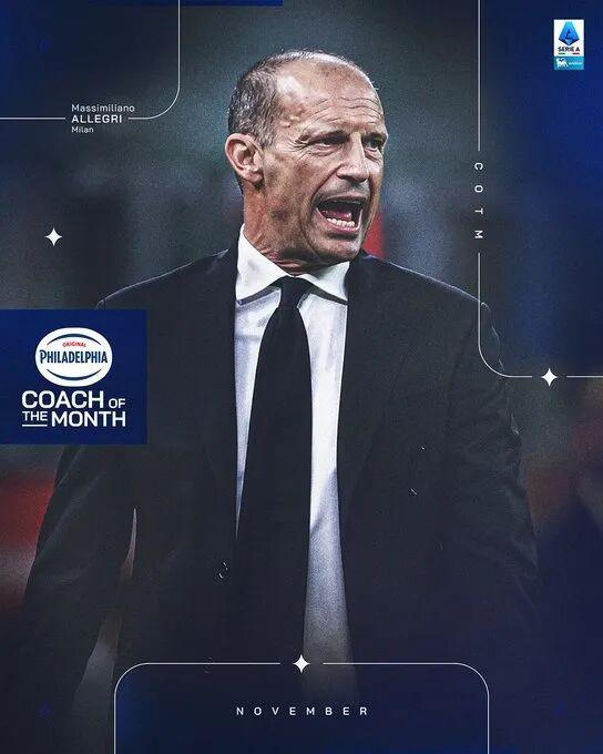 据意甲官网消息,米兰主帅阿莱格里被评为联赛11月最佳主帅。