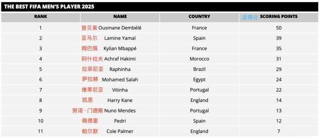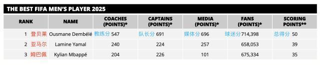 当地时间周二晚间,国际足联在卡塔尔多哈举办活动,公布年度各大奖项得主。奥斯曼·登贝莱以50分荣膺2025年国际足联世界足球先生,比巴萨的亚马尔高出11分,比皇马的姆巴佩高出15分。