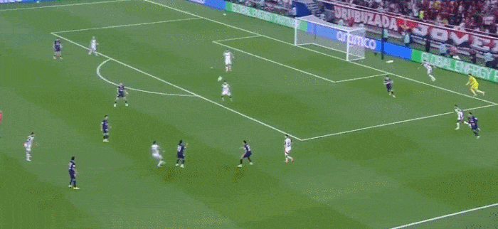 第9分钟,弗拉门戈门将罗西后场解围失误,法比安直接吊射空门入网。VAR介入,主裁吹罚此球出界在先,进球无效改判角球。