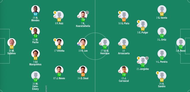 替补未出场:30-舍瓦利耶、89-雷纳托·马林、4-贝拉尔多、6-扎巴尔尼、9-贡萨洛·拉莫斯、21-卢卡斯·埃尔南德斯