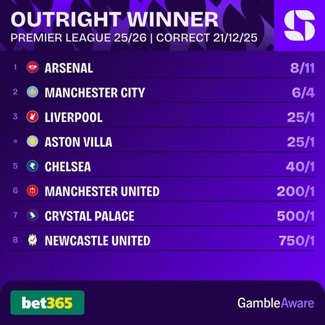 英超夺冠赔率:阿森纳、曼城前二,维拉升至并列第三