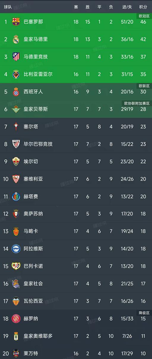 北京时间12月22日,西甲第17轮结束了9场比赛,最新积分榜如下!