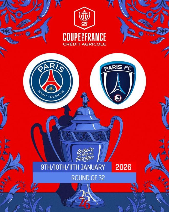 2025-26赛季法国杯32强对阵出炉,巴黎圣日耳曼将在主场对阵同城球队巴黎FC,两队将在一周内迎来法甲、法国杯连续交手。