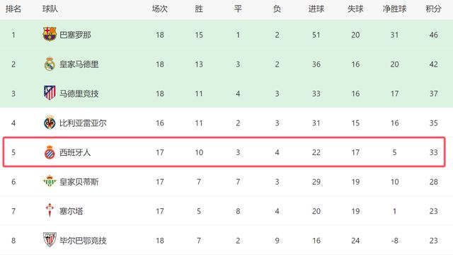 本场过后,西班牙人在西甲已经迎来5连胜,他们是除了巴萨之外,西甲近期状态最好的球队。截至目前,西班牙人继续排名第五,他们只落后第四的比利亚雷亚尔2分,和第三的马竞也只差4分。如果西班牙人继续保持状态,他们甚至有希望竞争前三。