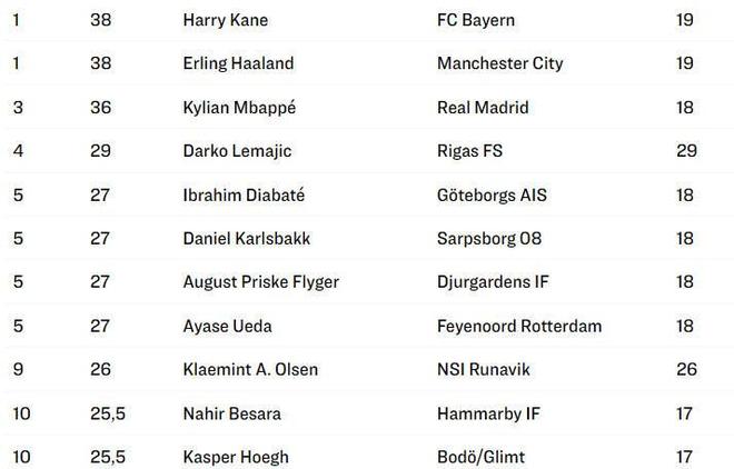 欧洲金靴最新排名:凯恩、哈兰德38分并列榜首,姆巴佩第二
