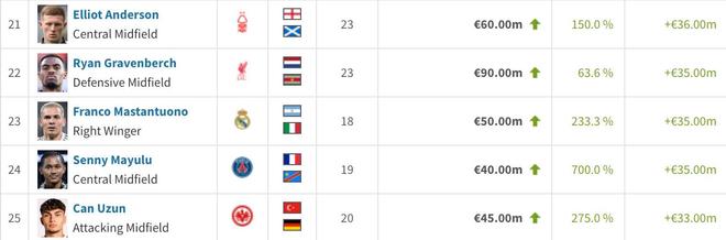 24. 马尤卢(巴黎圣日耳曼) +3500万欧元(+700%) 4000万欧元
