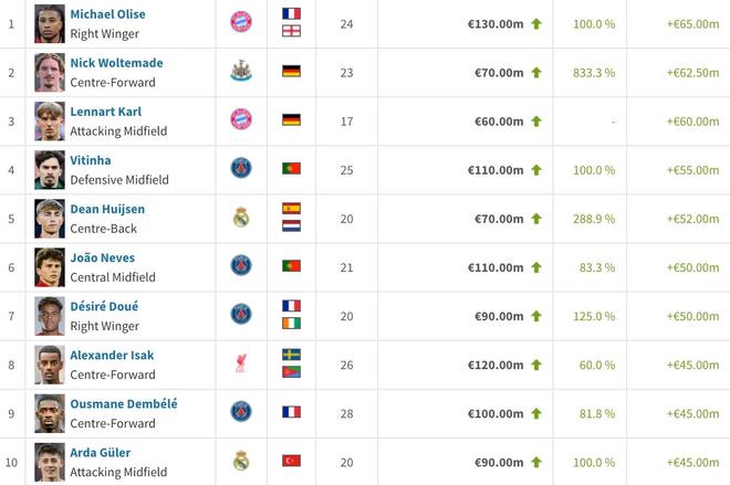 德转25年涨幅榜:奥利塞+6500万第1,沃尔特马德、卡尔二三位