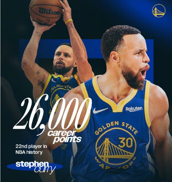 库里达成NBA生涯常规赛26000分里程碑,成为历史第22位达成该荣誉的球员。