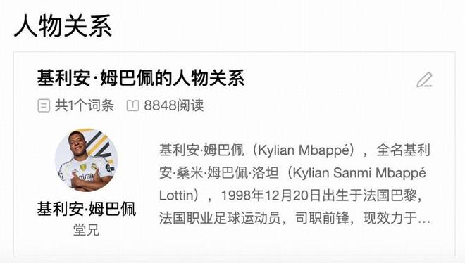 通过编辑纪录可查看,该词条在近半个月的时间里经过了12次的编辑,然后就编辑出了一个新版的姆巴佩。在人物关系上,这位姆巴佩被识别为了姆巴佩的堂弟。